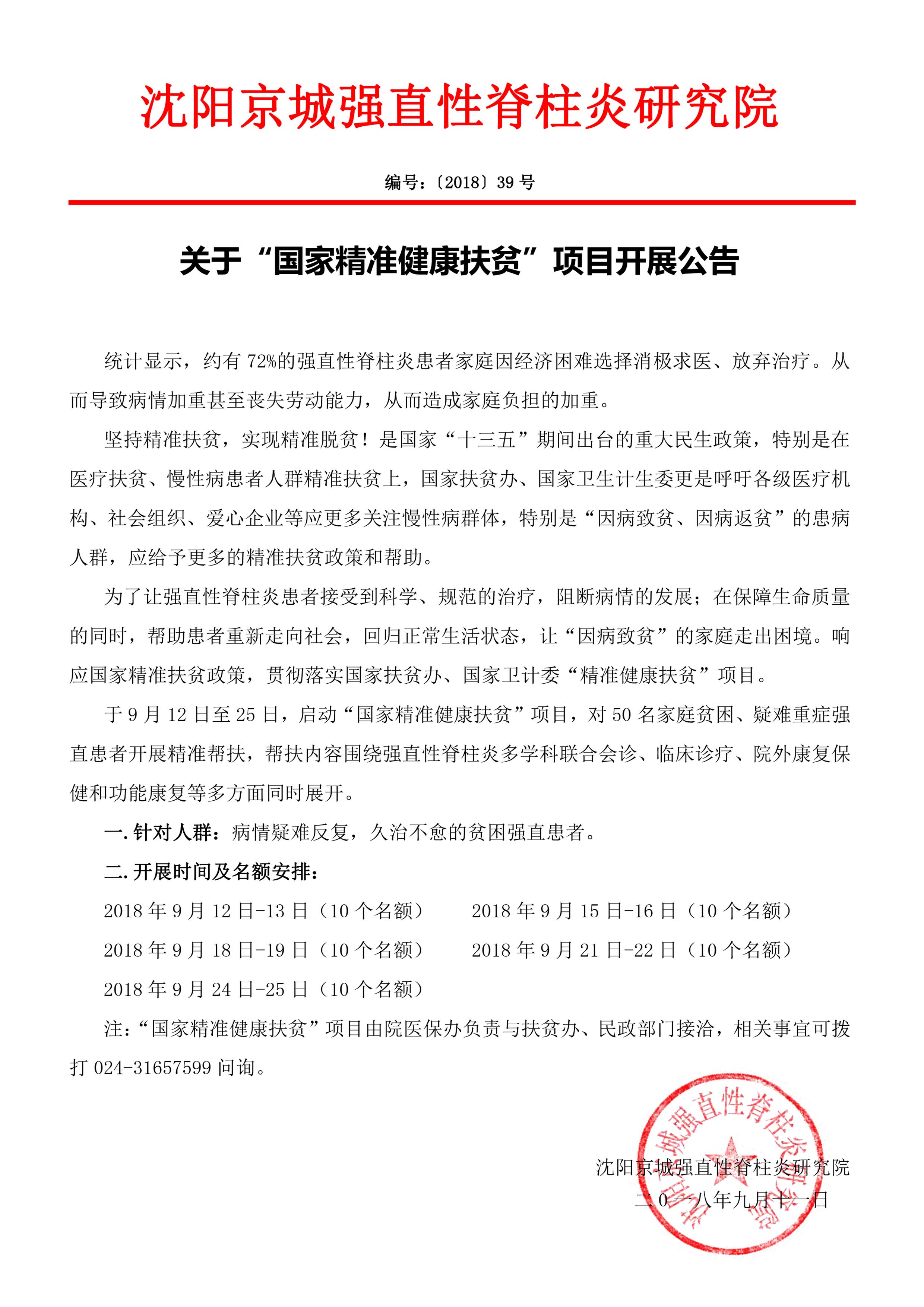 于9月12日至25日,启动“国家精准健康扶贫”项目,对50名家庭贫困、疑难重症强直患者开展精准帮扶,帮扶内容围绕强直性脊柱炎多学科联合会诊、临床诊疗、院外康复保健和功能康复等多方面同时展开。